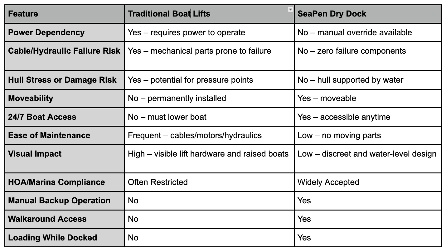 Traditional boat lifts have long been used to keep vessels out of the water, reducing marine growth and protecting hulls. While effective in many settings, they come with limitations that may not suit every boater or marina. As docking technology evolves, innovations like the SeaPen offer an alternative approach with added flexibility and ease of use. Below, we explore some of the key limitations of traditional lifts—and how SeaPen offers solutions to meet modern boating needs.